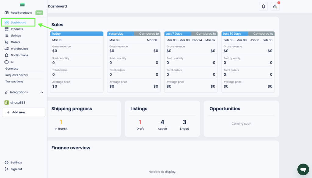 2. The Dashboard provides an overview of your store’s key performance metrics, including sales data, order tracking, and finance summaries.