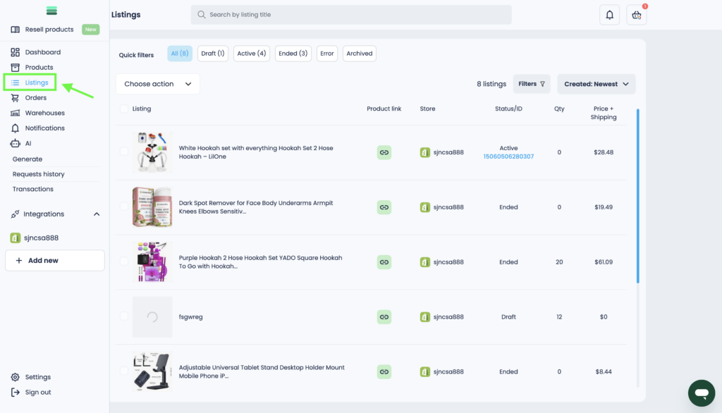 4. The Listings section displays all your listings, including drafts, active, and completed products.