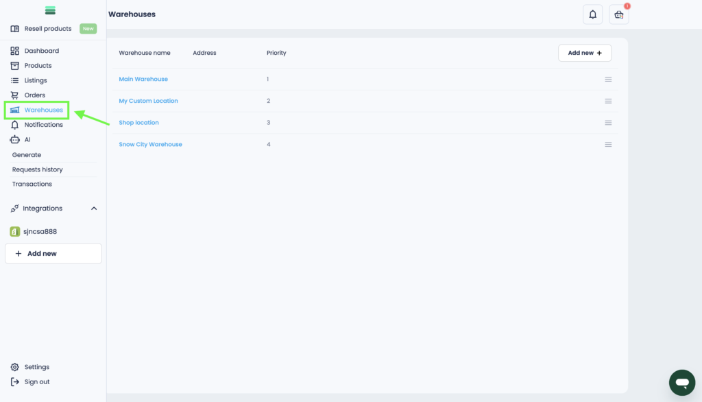 6. In the Warehouses section, you can set up and manage storage locations, track inventory levels, and organize stock distribution.