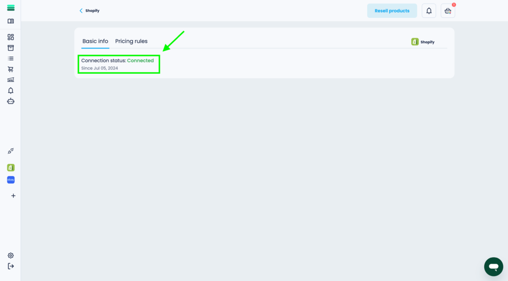 5. Once you have successfully completed all the instructions in the previous step, you will be redirected to your store section on Mysellerhub. The connected status will indicate the successful integration of your Shopify store with Mysellerhub.