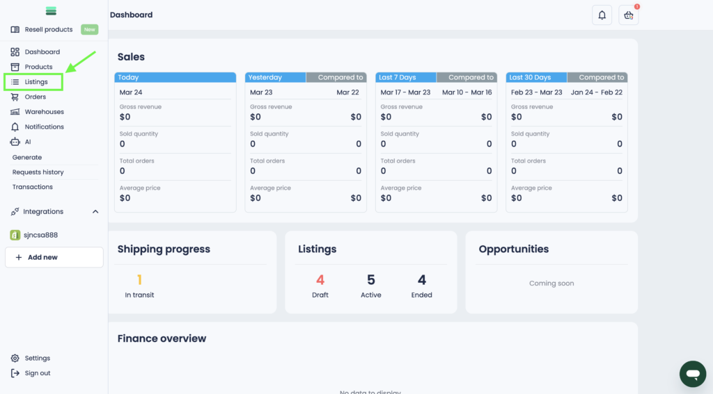 1. Open the side menu and go to the Listings section.
