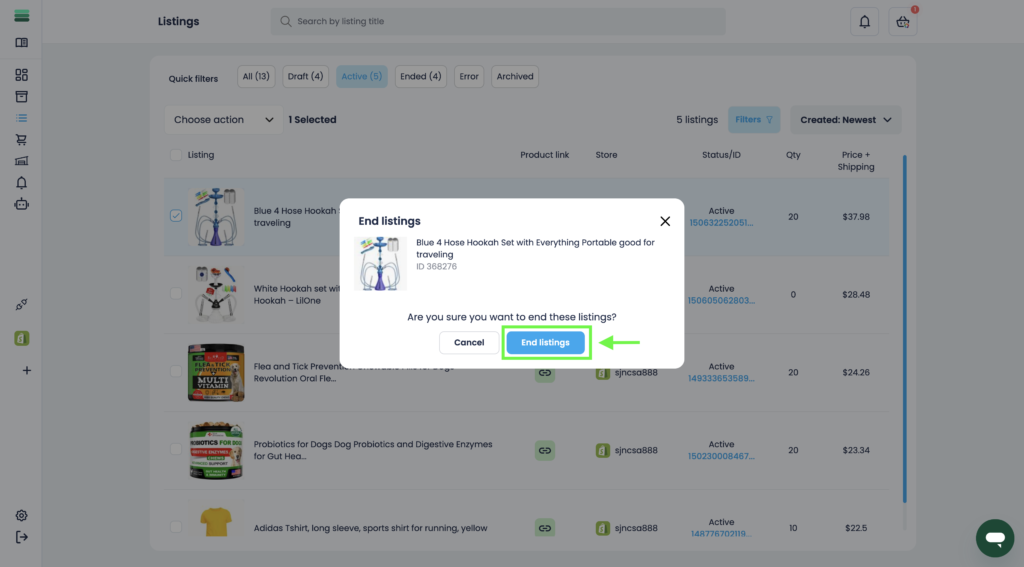4. In the pop-up window, confirm your action by clicking on the End listings button.
