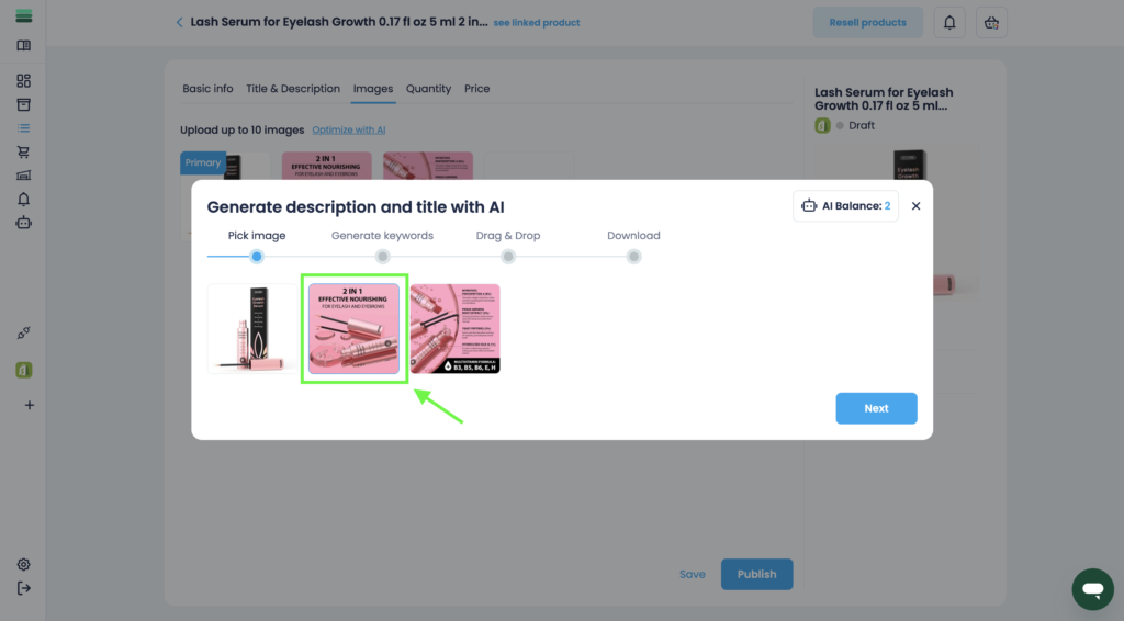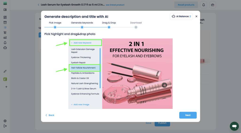 6. In step 3, you will see a list of generated keywords that you can already work with. Select 1 keyword and drag it onto your image.
