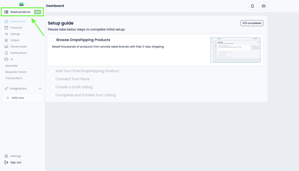 Before you start selling, you need to find and explore products that fit your business. In this step, you will learn how to browse the Resell Products section.