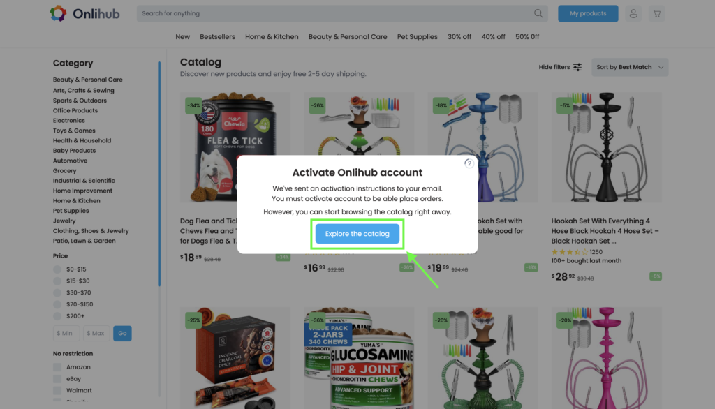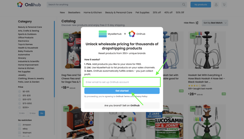 Important: The product catalog is powered by Onlihub, a partner platform integrated with Mysellerhub. To access it, you will need to provide your email address. You can learn more about Onlihub here.