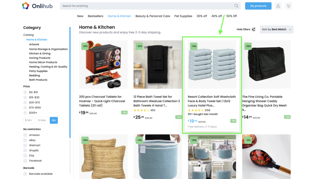 3. Once you’re in the Onlihub catalog, find the products that are right for your store. Check the price, discount and reviews. Click on a product to open its detailed page.