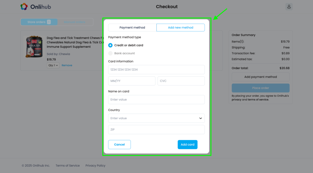 3. In the modal window, add a new payment method by completing the appropriate fields.