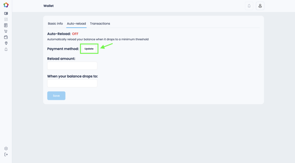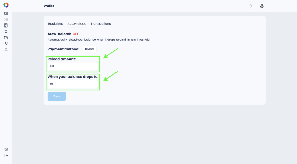 6. Specify the amount of replenishment in the Reload amount field and the minimum threshold for automatic replenishment. When your balance reaches the minimum threshold, the wallet will be automatically replenished with the amount you specified in the Reload amount field.